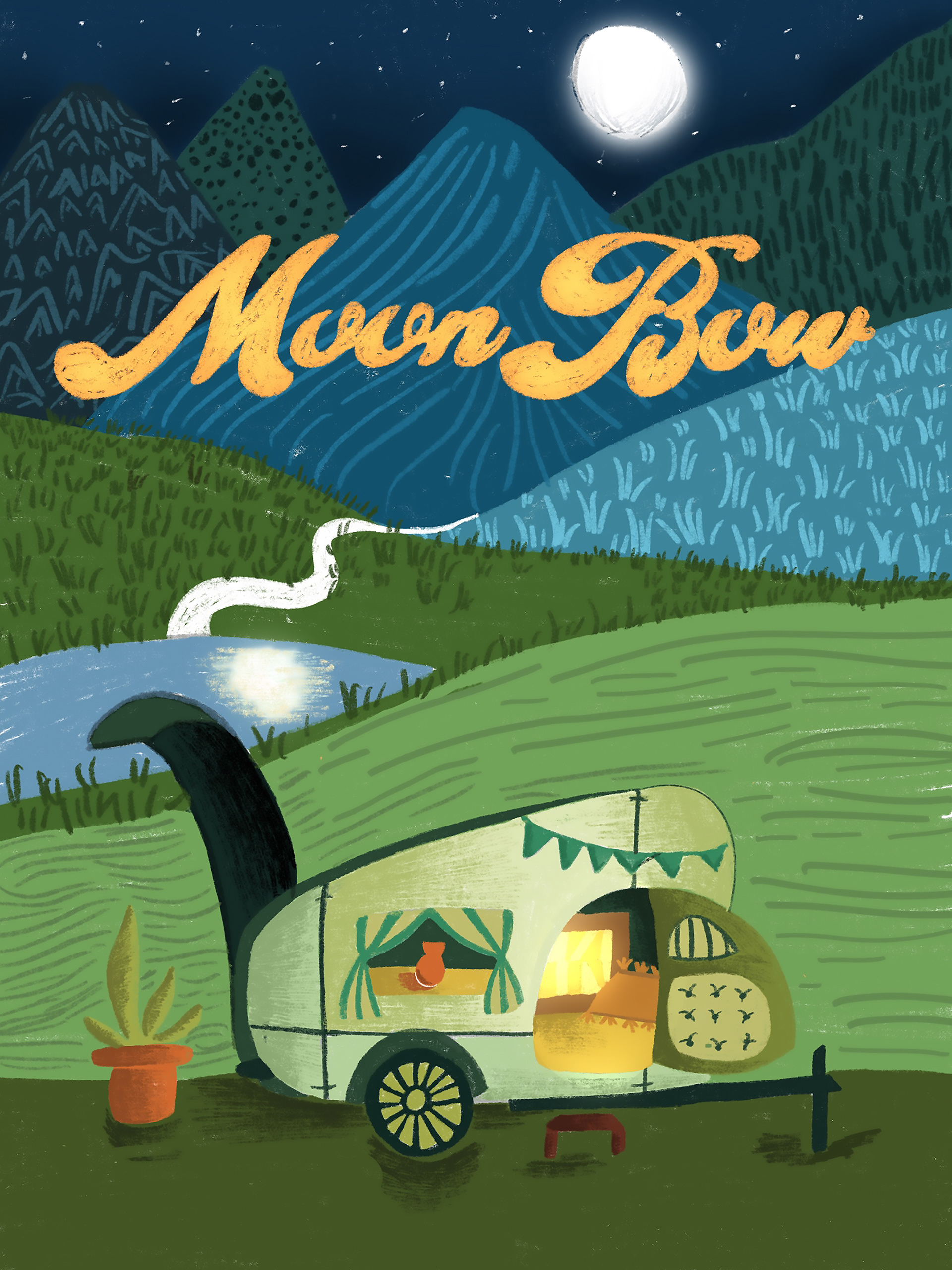 My rendition of Moon Bow. This was the title of our 2023 Illustration Show. I decided to showcase a night of camping and what the moons' reflection may due to the environment.